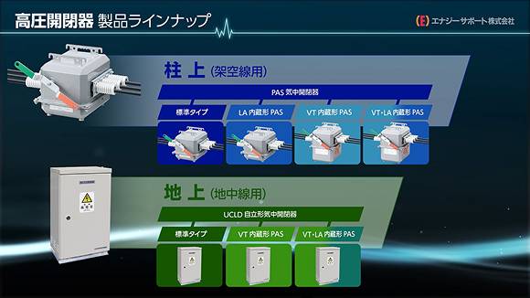 エナジーサポートは、架空線・地中線用の開閉器、カットアウト、限流ヒューズ付負荷開閉器、高圧ヒューズなど、受変電設備を守る電設資材を幅広く揃えています。信頼性・操作性に優れた製品で、電力の安定供給と波及事故防を実現し、安心な暮らしと産業活動の継続を支えます。